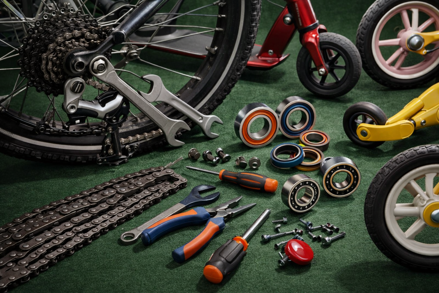 Provádíme drobné opravy a seřízení jízdních kol – typicky výměnu ložisek, výměnu řetězu, brzdových destiček a základní doladění chodu a vůlí. Pomůžeme také s běžnou údržbou, aby kolo jezdilo hladce, tiše a bezpečně. Kromě kol zajišťujeme i výměnu ložisek u kočárků, koloběžek, tříkolek a dalších podobných vozítek. Opravy řešíme rychle podle stavu dílů – buď ze skladových zásob, nebo na objednávku včetně zjištění ceny a termínu. |
